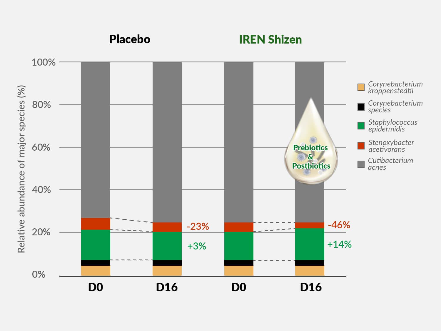 健康なマイクロバイオーム(皮膚に住む細菌)は、炎症や感染から守るために不可欠です。しかし、ほとんどのスキンケア製品には、良い皮膚細菌を一掃する抗菌防腐剤が含まれており、時間とともに皮膚の炎症や敏感さを引き起こします。プレバイオティクスとポストバイオティクスは、マイクロバイオームの維持とバランスに役立ち、これらの有害な成分からの肌の回復を助けます。私たちの研究は、私たちのフェイスオイルがマイクロバイオームに優しく、健康な皮膚細菌のバランスを乱さないことを決定的に示しています。使用開始からわずか15日で、私たちのフェイスオイルは良い細菌の成長を著しく増加させ、悪い菌株をはるかに上回り、最終的には肌のバリアを強化し、健康的な肌色を実現しました。